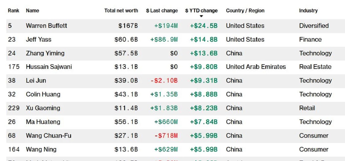 अमेरिका के वॉरेन बफे दुनिया के 5वें सबसे अमीर व्यक्ति हैं। इनकी कुल संपत्ति 167 अरब डॉलर है, जिसमें केवल इस साल 24.5 अरब डॉलर जुड़े। वॉरेन बफे इस साल के टॉप गेनर हैं। इस लिस्ट में अमेरिका के ही जेफ यास दूसरे नंबर पर हैं। दुनिया के 23वें सबसे अमीर इस व्यक्ति की कुल दौलत 60.6 अरब | डॉलर है। इस साल यास ने अपने नेटवर्थ में 14.8 अरब डॉलर जोडे़ हैं।