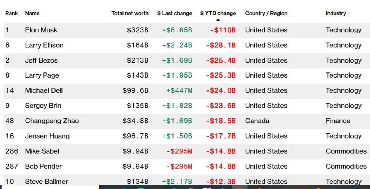 टॉप-10 लूजर्स की लिस्ट में 9 अमेरिकी और एक कनाडाई अरबपति है। इनमें सात टेक बिजनेस से जुड़े हैं। सबसे ऊपर नाम एलन मस्क का है। इन्होंने इस साल सबसे अधिक 110 अरब डॉलर गंवाए। लैरी एलिसन (28.1 अरब डॉलर), जेफ बेजोस (25.4 अरब डॉलर), लैरी पेज (25.3 अरब डॉलर), माइकल डेल (24 अरब डॉलर), सर्गी ब्रिन (23.6 अरब डॉलर) गंवाने वाले सबसे बड़े अमेरिकी टेक दिग्गज हैं।