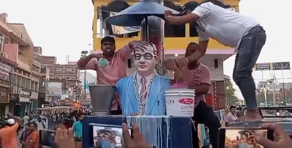 नई दिल्ली (New Delhi)। लोजपा (आर) के अध्यक्ष चिराग पासवान (President Chirag Paswan)के हाजीपुर से नामांकन(Nomination from Hajipur) दाखिल करने के बाद अनवरपुर चौक पर संविधान निर्माता बाबा आंबेडकर (Baba Ambedkar)की मूर्ति का माल्यार्पण (garlanding the statue)किया था। जिसके बाद प्रतिमा की दूध से धुलाई की गई। गुरुवार शाम में 51 लीटर दूध से धोने का वीडियो वायरल हुआ। हालांकि आपका अपना अखबार हिन्दुस्तान इस वीडियो की पुष्टि नहीं करता है। भीम आर्मी संघ के नेता रणधीर कुमार और अनवरपुर चौक निवासी छोटे पासवान के साथ कुछ युवा प्रतिमा धोने में जुटे थे। इन लोगों ने बताया कि चिराग ने प्रतिमा छू ली थी। इनका आरोप है कि चिराग दलित विरोधी हैं।