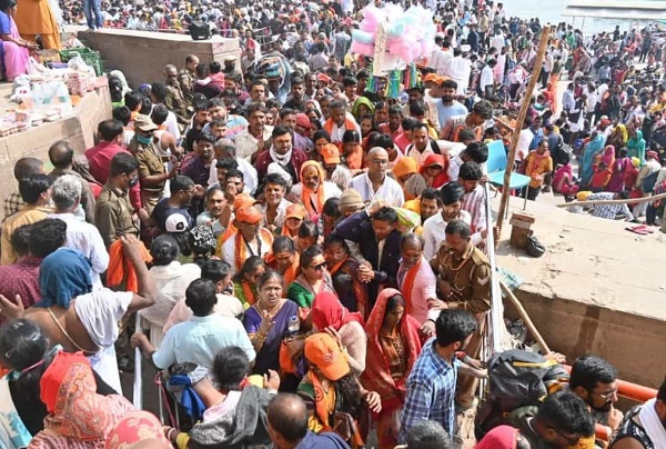 गोदौलिया चौराहे से मैदागिन की ओर पैदल जाना भी सहज नहीं था। एक छोर से दूसरे छोर तक सिर्फ लोग ही लोग दिख रहे थे। इनमें महिलाओं की तादाद भी खासी थी। बहुतेरे लोग छोटे बच्चों को भी साथ लिये थे। बच्चे थक रहे थे उन्हें कंधे पर बैठा ले रहे थे। भीड़ को बांटने के लिए पुलिस ने गिरजाघर-दशाश्वमेध मार्ग बंद कर दिया था। नई सड़क, बेनिया, लक्सा, लहुरबीर की तरफ से आने वाले यात्रियों को पुलिस गिरजाघर से गोदौलिया की ओर नहीं जाने दे रही थी। पूरी भीड़ को रामापुरा की तरफ भेज दिया जा रहा था। लोग गलियों से होते हुए जगमबाड़ी के पास पहुंच रहे थे। यहां भी तैनात पुलिस लोगों को जगमबाड़ी मठ के बगल में बनी गली में प्रवेश कराकर घाट की तरफ भेज रहे थे। इससे पूरी गली चोक हो गई थी और परेशानी का सामना करना पड़ा।