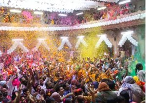 होली की खुशी में लड्डू और जलेबी लुटायी गईं, भक्तों ने लपक-लपक कर प्रसाद पाया। श्रद्धालुओं ने एक दूसरे को अबीर गुलाल लगाकर होली की बधाई दी। इसके बाद मंदिर अट्टालिका पर लगी हाईड्रोलिक पिचकारी से देवकी नंदन महाराज ने टेसू का रंग बरसाया। इस सुगंधित रंग में भीगने को हर किसी मे ललक दिखाई दी। श्रद्धालु भीगते हुए नृत्य करने लगे और ब्रज की अनूठी होली में खो गए।