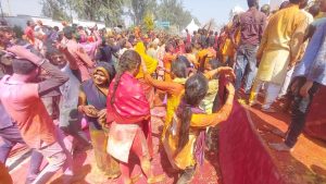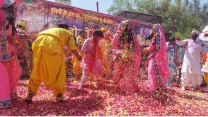वृन्दावन। बांकेबिहारी मंदिर (Banke Bihari Temple) में ब्रज की सातों प्रकार की होली खेली गई। श्रद्धालु-भक्तों (devout devotees) से खचाखच भरे मंदिर प्रांगण में जब हाइड्रोलिक पिचकारी से टेसू का रंग बरसा तो फाग के गीत जीवन्त हो गए। देवकी नंदन महाराज के साथ श्रद्धालु-शिष्यों ने ब्रज के प्रमुख महोत्सव का आनंद लिया। ब्रजवासियों (Brajwasis) की रसीले हास-परिहास से शुरू हुई होली लठमार और फूलों की होली में बदल गई।