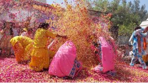 टेसू के फूलों से बने सुगंधित रंग की धार जिस भी श्रद्धालु पर पड़ी वह ब्रज की मस्ती में खो गया। वृंदावन में होली की कृष्ण कालीन परंपरा और गहरी हो गई। प्रियाकान्त जू विग्रह पर गुलाल लगाकर मंदिर सेवायतों ने होली की शुरूआत की। मंदिर परिसर में ढोल-नगाढ़े बजाकर श्रद्धालुओं में होली मनाने के घोषणा हो गई। देवकी नंदन महाराज (Devaki Nandan Maharaj) ने बृज की यह होरी रसभरी। तोय सौं कन्हैया, मोय रंग मत डारो। आज ब्रज में होरी रे रसिया। जैसे मधुर भजन गाए तो श्रद्धालु नृत्य करने लगे। मंच पर लोक कलाकारों के मीठी बृजभाषा में हास-परिहास का क्रम लठमार होली में परिवर्तित हो गया। इस बीच श्री राधा-कृष्ण स्वरूपों पर भक्तों ने पुष्पों की वर्षा कर फूलों की होली खेली।