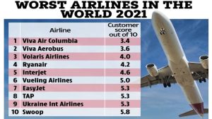 सबसे खराब एयरलाइंस की लिस्टिंग में 6ठे नंबर पर Vueling Airlines रही जिसे 10 में से 5 अंक मिले. सातवां नंबर था Easyjet का जिसे रैंकिंग में 5.3 अंक मिले. लिस्ट में 8वें पायदान पर TAP Airlines रही तो 9वें पर Ukraine Int Airlines और 10 वां नंबर था Swoop Airlines का. सातवें से नवें पायदान पर मौजूद तीन एयरलाइंस को 5.3 अंक मिले तो Swoop ने जैसे तैसे 5.8 अंक लेकर अपनी लाज बजाई.