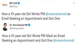 भाजपा के ट्विटर हैंडल (@BJPLive) पर इसकी जानकारी देते हुए लिखा गया है, ‘10 साल की बच्ची ने ईमेल किया कि वह प्रधानमंत्री से मिलना चाहती है और पीएम ने उससे मुलाकात की’. मीडिया रिपोर्ट्स के अनुसार, पीएम नरेंद्र मोदी ने मेल के जवाब में लिखा था ‘दौड़कर चले आओ’, जिसके बाद बच्ची की पीएम से मुलाकात हुई. यह 10 साल की बच्ची अनिशा राधाकृष्णन विखे पाटिल की पोती है. वहीं, डॉ सुजय विखे पाटिल ने भी मुलाकात की तस्वीरें शेयर की हैं, लेकिन उन्होंने ईमेल का कोई जिक्र नहीं किया है.