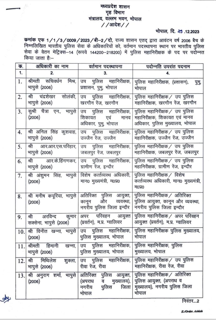 वहीं, 13 अधिकारी जिसमें उप पुलिस महानिरीक्षक, अतिरिक्त पुलिस आयुक्त, विशेष कर्तव्यस्थ अधिकारी, अपर परिवहन आयुक्त पद पर पदस्थ अधिकारियों को पुलिस महानिरीक्षक के पद पर पदोन्नत किया गया है। इसमें रुचिवर्धन मिश्र, चंद्रशेखर सोलंकी, चैत्रा एन, अनिल सिंह कुशवाह, आरआरएस परिहार, आरके हिंगणकर, अंशुमन सिंह, मनीष कपूरिया, अरविंद कुमार सक्सेना, विनीत खन्ना, हिमानी खन्ना, मिथिलेश शुक्ला और अनुराग शर्मा का नाम है। इसके अलावा 18 अधिकारियों को उप पुलिस महानिरीक्षक के पद पर पदोन्नत किया गया है।