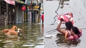 कमर से ऊपर पानी में नवजात बच्चे को बचाने की कोशिश