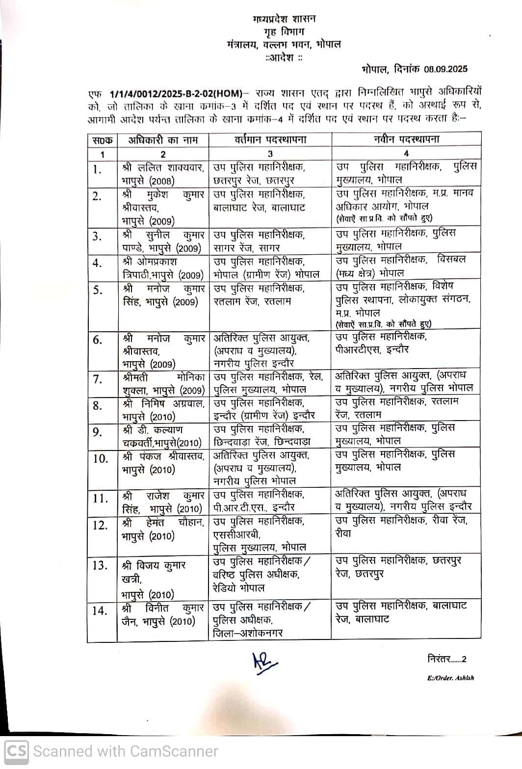 इसके अलावा मोनिका शुक्ला को क्राइम एडीसीपी भोपाल और राजेश कुमार सिंह को क्राइम एडीसीपी इंदौर बनाया गया है. मयंक अवस्थी धार के एसपी और राजीव कुमार मिश्रा अशोकनगर के एसपी होंगे. मनोज कुमार सिंह डीआईजी रतलाम की पदस्थापना लोकायुक्त संगठन में डीआईजी के तौर पर की गई है. निमिष अग्रवाल डीआईजी इंदौर ग्रामीण को डीआईजी रतलाम रेंज, डी कल्याण चक्रवर्ती डीआईजी छिंदवाड़ा को डीआईजी पीएचक्यू, हेमंत चौहान डीआईजी एससीआरबी पीएचक्यू को डीआईजी रीवा रेंज बनाया गया है.