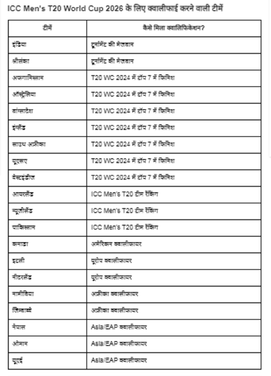 इस तरह टी20 विश्व कप के लिए क्वालीफाई करने वाली 20 टीमों में मेजबान भारत और श्रीलंका के अलावा पाकिस्तान, बांग्लादेश, इंग्लैंड, न्यूजीलैंड, ऑस्ट्रेलिया, दक्षिण अफ्रीका, वेस्टइंडीज, जिम्बाब्वे, अफगानिस्तान, नेपाल, ओमान, यूएई, इटली, नीदरलैंड, नामीबिया, अमेरिका, कनाडा और आयरलैंड की टीम शामिल है। टूर्नामेंट फरवरी-मार्च में अगले साल खेला जाएगा। आईसीसी का अगला लक्ष्य अब टूर्नामेंट के शेड्यूल फाइनल करने पर होगा, क्योंकि सभी 20 टीमों की ऐलान हो चुका है। इस बार भी टूर्नामेंट का फॉर्मेट वही है, जो पिछले साल रखा गया था। पांच-पांच टीमों के चार ग्रुप बनेंगे और उनमें से 2-2 टीमों को सुपर 8 में जगह मिलेगी। इसके बाद सेमीफाइनल और फाइनल मैच खेला जाएगा।