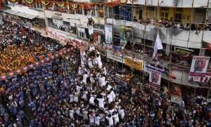 मानव पिरामिड टूटते ही कई गोविंदा-एक दूसरे पर गिरे