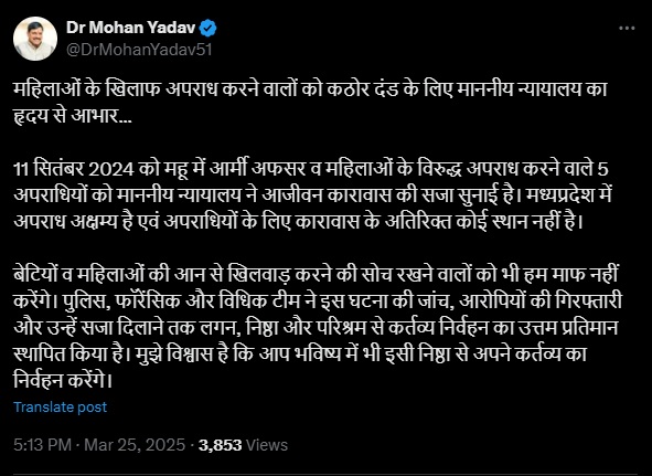 आर्मी अफसर व महिलाओं के साथ सनसनीखेज घटना के 5 आरोपियों को न्यायालय ने आजीवन कारावास की सजा सुनाई है. 11 सितंबर को हुई इस घटना के मामले में 6 आरोपियों को गिरफ्त में लिया गया था, इनमें एक आरोपी नाबालिग निकला. इस प्रकरण में आरोपियों को पकड़ने एवं उन्हें सजा दिलाने में आईजी ग्रामीण अनुराग एवं डीआईजी निमिष अग्रवाल के निर्देश पर एसपी हितिका वासल के मार्गदर्शन में एवं एएसपी रूपेश कुमार द्विवेदी एवं अनुविभागीय अधिकारी (पुलिस) महू दिलीप सिंह चौधरी के नेतृत्व में थाना प्रभारी-बड़गोंदा निरीक्षक लोकेन्द्र हिहोर (अनुसंधानकर्ता) सहित अन्य ने महत्वपूर्ण भूमिका निभाई है.