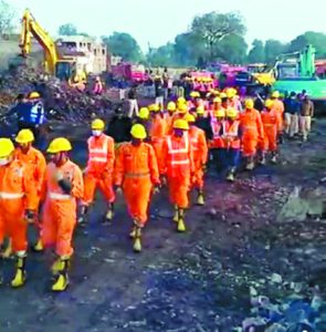 हरदा। हरदा के मगरधा रोड पर बनी अवैध पटाखा फैक्ट्री के तल घर की छतें उठाने के लिए पांच जेसीबी रातभर जुटी रही और बचाव दल ने तलघर में पहुंचने के बाद तब राहत की सांस ली, जब अंदर कोई और हताहत नहीं मिला। हादसे में 11 लोगों की मौत हो गई थी और लगभग 200 लोग घायल हुए थे। इनमें कई घायलों को मामूली चोट आई है और सभी लोग खतरे से बाहर बताए जा रहे हैं। बचाव कार्य अभी भी जारी है और बड़ी संख्या में राहतकर्मी वहां मौजूद हैं,