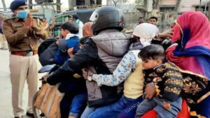 पहले आप इस तस्वीर को ध्यान से देखिए। फिर आगे या पीछे। आपकी जिधर से भी मर्जी हो, आप उधर से बाइक पर सवार लोगों की गिनती शुरू कर सकते हैं। इस बाइक पर आपको 7 लोग बैठे मिलेंगे, जिसमें हर उम्र के बच्चे, युवा और महिला दिखेंगी। पूरा का पूरा परिवार एक बाइक पर समा गया। बाइक के आगे वाले हिस्से पर तीन बच्चे बैठे हैं। इसके बाद इन बच्चों के पिता। फिर एक बच्चा। इसकी बाद सबसे पीछे मां और उनकी गोद में एक छोटा मासूम सा बच्चा। इस फोटो को चार चांद लगा रहे हैं सामने खड़े पुलिस ऑफिसर, जो हाथ जोड़ कर इन्हें ऐसा न करने की विनती कर रहे हैं।