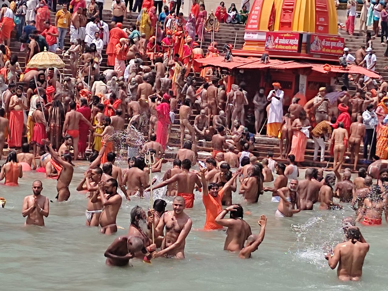 उनका स्नान संपन्न होने के बाद जूना अखाड़े के आचार्य महामंडलेश्वर स्वामी अवधेशानंद गिरी (Acharya Mahamandaleshwar Swami Awadheshanand Giri) की अगुवाई में जूना अखाड़े के संत महंतों ने पवित्र गंगा में डुबकी लगाई। जूना अखाड़ा के साथ अग्नि, आह्वान तथा किन्नर अखाड़ा भी स्नान में सम्मिलित हुआ। तीसरे क्रम पर महानिर्वाणी और साथ मे अटल अखाड़े के साधु संत स्नान कर चुके हैं। तीनों बैरागी अखाड़े (निर्मोही, दिगम्बर तथा निर्वाणी) के संत महात्मा हर की पैड़ी में प्रवेश के लिए पहुंच चुके हैं।