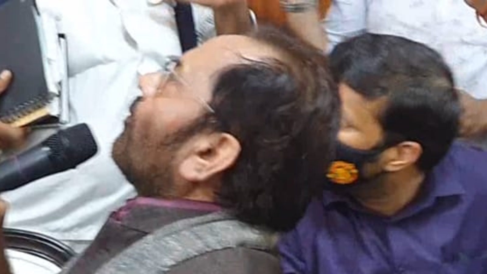 रामपुर । रामपुर (Rampur) में अपने 4 दिवसीय दौरे पर पहुंचे केंद्रीय मंत्री मुख्तार अब्बास नकवी (Union Minister Mukhtar Abbas Naqvi) गुरुवार को बड़े हादसे का शिकार हो गए. वे 16 अक्टूबर से होने वाले हुनर हाट की तैयारियों को देखने के लिए राज्यमंत्री बलदेव ओलख (Minister of State Baldev Olakh) के साथ पहुंचे थे. तैयारियों का जायजा लेने के बाद जब वे पत्रकारों से बातचीत के लिए कॉन्फ्रेंस में पहुंचे तो वहां की छत गिर (roof fell) गई. इस दौरान नकवी, ओलख और डीएम रविंद्र कुमार उसके नीचे थे. गनीमत ये रही कि किसी के भी इस दौरान चोट नहीं लगी और सभी बाल बाल बच गए.