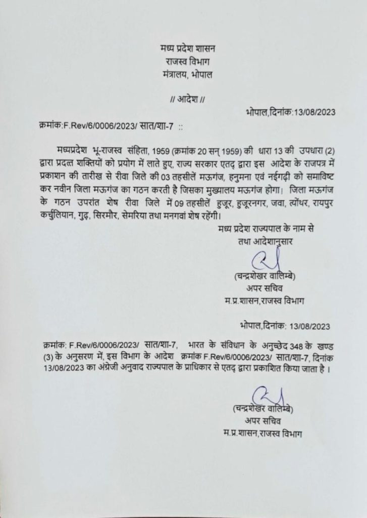 भोपाल। रीवा से अलग होकर मऊगंज अब 53वां जिला बन गया है। सरकार की तरफ से इसके लिए अधिसूचना जारी कर दी गई है। बता दें कि रीवा जिले की 03 तहसीलें मऊगंज, हनुमना एवं नईगढ़ी को समाविष्ट कर नवीन जिले का गठन किया जा चुका है। जिसका मुख्यालय मऊगंज होगा। जिसकी कुल जनसंख्या 6 लाख 16 हजार 645 होगी। इनमें 6 लाख मतदाता होंगे।