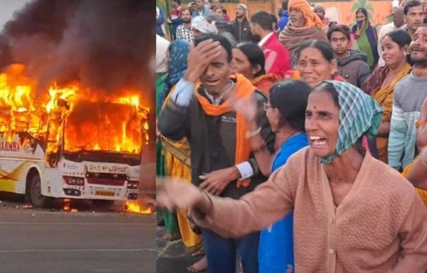 वृंदावन। महाकुंभ (Mahakumbh) से लौट रही तेलंगाना (Telangana) के श्रद्धालुओं की बस (Bus of devotees) में वृंदावन (Vrindavan) में भीषण आग लग गई। इससे एक श्रद्धालु की जिंदा जलकर मौत हो गई। आग इतनी भीषण थी कि देखते ही देखते सबकुछ जलकर राख हो गया। सामने खड़े श्रद्धालु अपनी आंखों के सामने सबकुछ जलता देखकर रोते रहे। आग लगने का कारण पता नहीं चल सका है। आशंका जताई जा रही है कि कोई बुजुर्ग बीड़ी पीते हुए बस में सो गया और उसी से पहले सीट फिर पूरी बस में आग फैली। डीएम, एसएसपी ने श्रद्धालुओं की वापसी का इंतजाम कराया है।