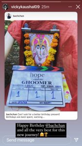 इस खास दिन पर विक्की कौशल (Vicky Kaushal) ने अपनी इंस्टाग्राम स्टोरी पर अभिषेक बच्चन के नए प्रोजेक्ट के बारे में जानकारी दी. विक्की ने कैप्शन में लिखा- ‘बच्चन इससे बेहतर बर्थडे गिफ्ट और क्या हो सकता है. बेहतरीन दिन बीतेगा…काम के साथ.’ इसके साथ ही विक्की कौशल ने लिखा- ‘हैप्पी बर्थडे अभिषेक बच्चन और नए सफर के लिए ढेर सारी शुभकामनाएं.’