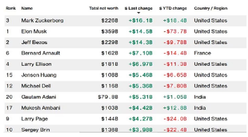 ब्लूमबर्ग बिलेनियर इंडेक्स के मुताबिक तेजी के तूफान में जेफ बेजोस की संपत्ति एक ही दिन में 14.3 अरब डॉलर उछलकर 229 अरब डॉलर पर पहुंच गई। मार्क जुकरबर्ग की दौलत में 16.1 अरब डॉलर का इजाफा हुआ और अब उनका नेटवर्थ 226 अरब डॉलर पर पहुंच गया है। लैरी एलिसन ने भी 6.97 अरब डॉलर कमाए। अब इनका नेटवर्थ 181 अरब डॉलर हो गया है।