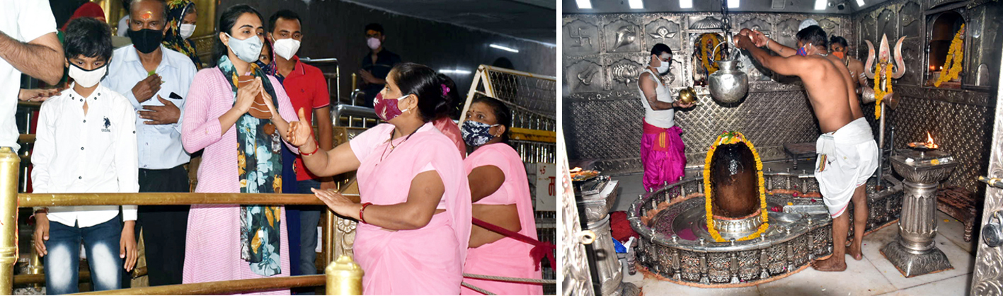 80 दिनों बाद आज महाकाल के द्वार आम श्रद्धालुओं के लिए खोले गए, सुबह 6 बजे से मंदिर खुला तो जिन श्रद्धालुओं की बुकिंग थी वह पहुँच गए। आज दिन भर 500 की संख्या में अलग-अलग भागों में शाम 8 बजे तक दर्शन कराए जाएंगे। आज सुबह जैसे दर्शन शुरू हुए तो कैबिनेट मंत्री डॉ. मोहन यादव और बाद में सांसद अनिल फिरोजिया भी दर्शन करने पहुँचे। आज गेट नंबर 4 भस्मारती द्वार से श्रद्धालुओं को उनके वैक्सीन सर्टिफिकेट देखने और हाथ सेनीटाइजर कराने के बाद प्रवेश दिया जा रहा था। बाहर तो सोशल डिस्टेंसिंग के लिए मंदिर प्रबंध समिति ने प्रयास किए थे लेकिन मंदिर के अंदर जाने के बाद श्रद्धालु सोशल डिस्टेंसिंग का पालन नहीं कर पा रहे थे। ऐसे में प्रशासन को चाहिए कि मंदिर में प्रवेश में कढ़ाई से पालन करवाए, नहीं तो कोरोना का डेल्टा प्लस वेरिएंट चल रहा है और इसके मरीज भी मध्यप्रदेश में मिल रहे हैं। उज्जैन में भी पूर्व में 2 मरीज मिल चुके हैं। इसको देखते हुए सोशल डिस्टेंसिंग का पालन करना आवश्यक है। क्योंकि महाकाल मंदिर में बाहर के प्रदेशों के श्रद्धालु अधिक संख्या में आते हैं और यदि लापरवाही की गई तो डेल्टा प्लस वैरीअंट उज्जैन में फिर फैल सकता है।