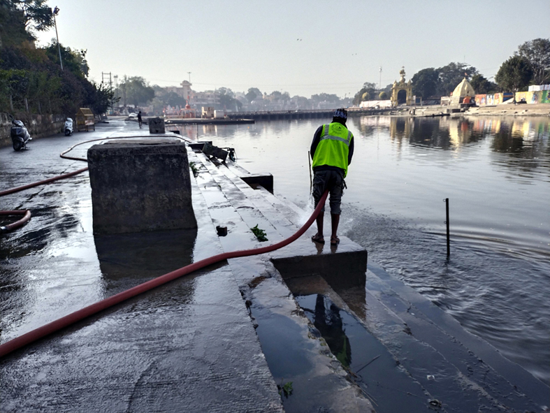 शिप्रा नदी को प्रदूषण मुक्त बनाने के लिए संतों ने अभी भी शासन-प्रशासन के खिलाफ मोर्चा खोल रखा है। इसी के साथ सप्त सागरों के सुधार को लेकर भी पिछले एक पखवाड़े से संत गोवर्धन सागर तट पर धरना दे रहे हैं। इसके बावजूद शिप्रा में कान्ह नदी और नालों का पानी मिलना बंद नहीं हुआ है। पिछले दिनों मौनी अमावस्या पर स्नान को देखते हुए एक बार फिर त्रिवेणी क्षेत्र में कान्ह नदी के दूषित पानी को रोकने के लिए मिट्टी का पाला बनाया गया था। यह भी अधिक समय ठहर नहीं पाया और सारा पानी शिप्रा में मिलने से त्रिवेणी से लेकर रामघाट तक अभी भी दूषित और काला पानी भरा हुआ है। इधर पिछले एक हफ्ते से छोटे पुल से लेकर बड़े पुल तक 4 बड़े नाले शिप्रा में दूषित पानी बड़ी मात्रा में उड़ेल रहे थे। इसके चलते बड़े पुल के पास गंदगी के कारण काले पड़े गए थे। क्षेत्र में नदी का पानी भी गहरा काला हो गया था। आज सुबह घाटों पर जमी नालों की गंदगी को साफ करने के लिए नगर निगम का अमला फायटर वाहन लेकर पहुँचा। पानी के तेज प्रेशर के साथ घाटों की धुलाई की तो इसका सारा दूषित और काला पानी शिप्रा में ही मिलता रहा। कुल मिलाकर कान्ह नदी के साथ-साथ शहर के बड़े नाले भी शिप्रा को रोज प्रदूषित कर रहे हैं। अभी तक जितने प्रयास हुए हैं वे सब बेकार साबित हुए हैं।