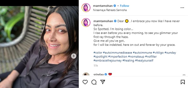अपने इस पोस्ट में ममता मोहनदास ने कलर, ऑटोइम्यून डिजीज, विटिलिगो और सनलाइट जैसे हैशटैग का भी इस्तेमाल किया है. ममता के पोस्ट पर एक्ट्रेस रेबा मोनिका जॉन (actress reba monica john) ने रिएक्शन देते हुए कमेंट किया, ‘तुम एक फाइटर हो और तुम खूबसूरत हो.’ एक फैन ने कमेंट किया, ‘आप बहुत पावरफुल महिला हैं. मैं आपसे सच में प्यार करता हूं. हमें प्रेरणा देती रहिए.’ एक और फैन ने लिखा, ‘आप हम सभी के लिए फाइटर और प्रेरणा हैं. आप जरूर अच्छी हो जाएंगी. गॉड ब्लेस यू.’