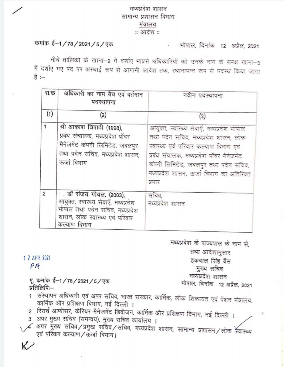 इंदौर। शासन द्वारा विद्युत वितरण कंपनी के सचिव आकाश त्रिपाठी को आयुक्त स्वास्थ्य सेवाएं मध्य प्रदेश बनाया गया है। इसके अतिरिक्त इन्हें प्रबंध संचालक मध्य प्रदेश पश्चिम विद्युत वितरण मैनेजमेंट कंपनी लिमिटेड जबलपुर तथा पदेन सचिव मध्य प्रदेश शासन ऊर्जा विभाग का प्रभार भी दिया गया है। मध्य प्रदेश के मुख्य सचिव इकबाल सिंह बैस द्वारा जारी किए गए आदेश में आयुक्त स्वास्थ्य सेवाएं संजय गोयल को सचिवालय भेजते हुए सचिव बनाया गया है। उल्लेखनीय है कि मध्य प्रदेश में बढ़ती को रोना मारामारी पर काबू पाने के लिए शासन द्वारा फेरबदल किया गया है।