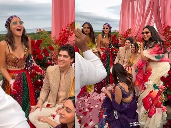 आलिया भट्ट ने कान फिल्म फेस्टिवल के बाद अपनी दोस्त तान्या साहा गुप्ता और डेविड एंजेलोव की शादी के लिए स्पेन रवाना हुई थी। तस्वीरों और वीडियो में आलिया को लाल और हरे रंग के लहंगा-चोली, धूप के चश्मे और सिर पर बंदाना पहने हुए ब्राइड्समेड के रूप में देखा जा सकता है। एक्ट्रेस इस लुक में बेहद खूबसूरत लग रही हैं। वीडियो में आलिया के साथ उनकी एक्टर दोस्त आकांक्षा रंजन कपूर भी नजर आ रही हैं, एक्ट्रेस ने बैंगनी रंग का लहंगा पहना हुआ है।