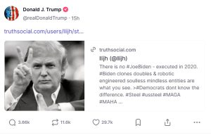 वाशिंगटन. अमेरिकी राष्ट्रपति (US President) डोनाल्ड ट्रंप (donald trump) ने रविवार को अपने सोशल मीडिया (Social media) प्लेटफॉर्म ‘ट्रुथ सोशल’ (Truth Social) पर बहुत अजीबोगरीब दावे के साथ एक पोस्ट शेयर किया. ट्रंप के इस पोस्ट में पूर्व राष्ट्रपति जो बाइडेन को लेकर कॉन्सपिरेसी थ्योरी गढ़ी गई थी. अमेरिकी राष्ट्रपति ने दावा किया कि जो बाइडेन की 2020 में मौत हो गई थी और उनकी जगह उनके रोबोटिक क्लोन ने ले ली है. एक अनजान अकाउंट से सोशल मीडिया पर शुरू हुई इस कॉन्सपिरेसी थ्योरी में बाइडेन को ‘मार डाला गया’ और उनकी जगह ‘रोबोट द्वारा तैयार की गई निष्प्राण, नासमझ मशीन’ को लाने के बारे में असाधारण दावे किए गए थे. डोनाल्ड ट्रंप ने इस अनजान अकाउंट से किए गए इस पोस्ट को रिपोस्ट किया है.