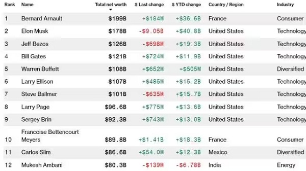 इस लिस्ट में दूसरे से नौवें पायदान तक अमेरिका का जलवा है। 10वें पर फिर फ्रांस है। इस लिस्ट की एक और खास बात है। टॉप-10 अरबपतियों में 7 टेक्नॉलजी इंडस्ट्रीज से हैं और दो कंज्यूर से। वॉरेन बफेट डायवर्सिफायड से हैं। फ्रांस वाले दोनों अरबपति कंज्यूमर इंडस्ट्री वाले कैटगरी में हैं।
