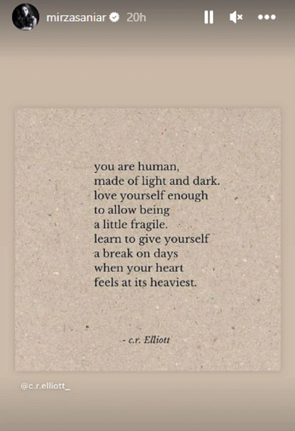 इंस्टाग्राम (Instagram) स्टोरी में सानिया ने पोस्ट शेयर कर लिखा, ‘आप इंसान हैं. उजाले और अंधेरे से बने हैं. आप खुद से बेहद प्यार करें, जब आप थोड़ा नाजुक होने लगें. आप खुद को ब्रेक देना सीखें, तब जब आपका दिल भारी महसूस करता है.’