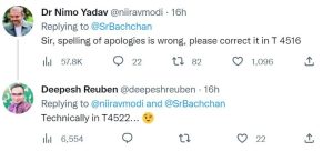 वहीं, इस ट्वीट में अभिनेता ने माफी की स्पेलिंग गलत होने पर यूजर ने अपनी प्रतिक्रिया देते हुए लिखा, सर माफी की स्पेलिंग गलत है, कृपया इस टी 4516 में सुधार लें।