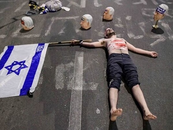 टाइम्स ऑफ इजरायल में छपि रिपोर्ट के अनुसार, तेल अवीव में प्रदर्शन के दौरान एक व्यक्ति अपने शरीर पर नकली खून से सने पट्टियों के साथ सड़क पर पड़ा दिखा, उसके चारों ओर नेतन्याहू के मुखौटे रखे गए थे, जिन पर “गुनहगार” और “खतरा” जैसे शब्द लिखे थे। इस दृश्य ने राजनीतिक माहौल को और अधिक तनावपूर्ण बना दिया।