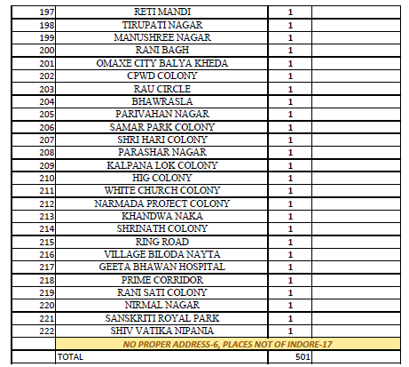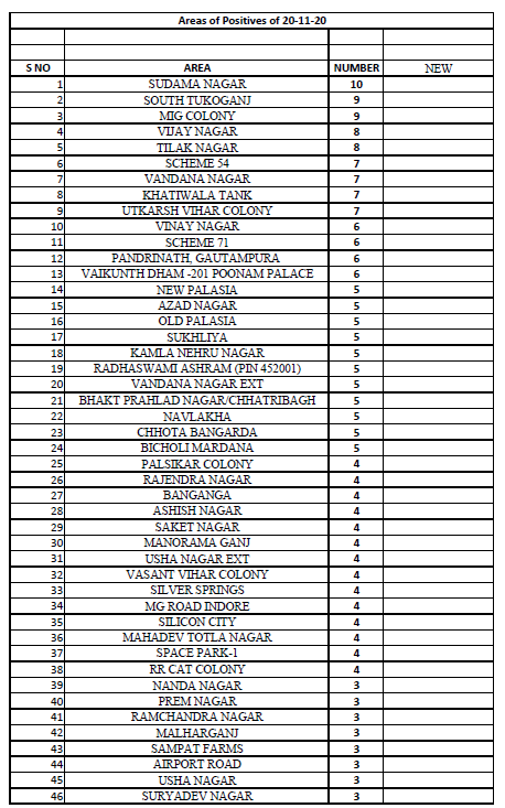 इंदौर। 20 नवंबर को सीएमएचओ की रिपोर्ट के अनुसार इंदौर में 492 नए पॉजिटिव मामले सामने आए है। 4684 सैंपल जांच के लिए भेजे गाए और 152731 रैपिड टेस्टिंग सैंपल और 4684 सैम्पल आज प्राप्त किये गये थे। टेस्ट में 4153 नेगेटिव है, साथ ही इंदौर में पॉजिटिव मरीज़ो की कुल संख्या 37115 हो गई है। साथ ही रिपीट पॉज़िटिव सैंपल की संख्या 38 है। आज दिनांक तक कुल 729 संक्रमित मरीज़ो की मृत्यु हो चुकी है। ज़िले में उपचाररत् कोरोना पॉज़िटिव मरीज़ की संख्या 2693 हो गई है।