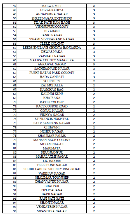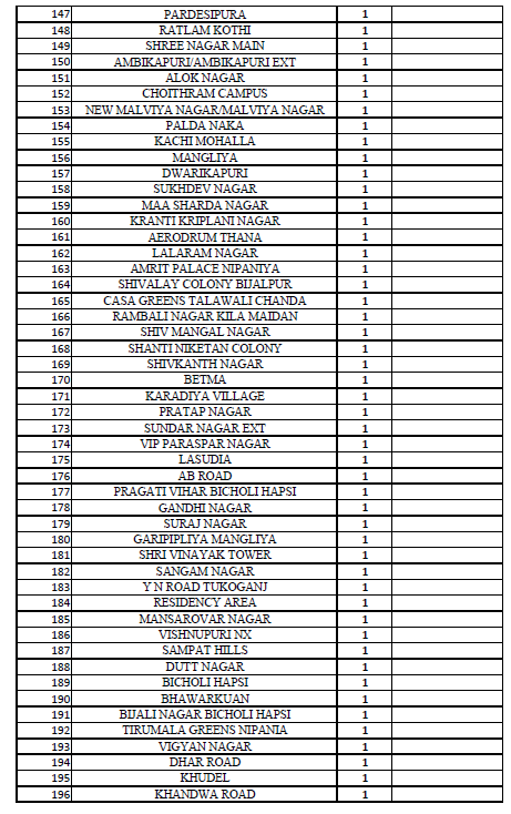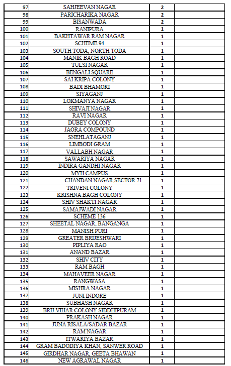 इसमे सुदामा नागर, साउथ तुकंज, विजय नागर, तिलक नागर, स्कीम ५४, वंदना नागर, खेतिवाला टैक, गौतमपुरा, पलासिया, आजाद नागर, कमला नेहरू नागर, वंदना नागर जैसे इलाके शामिल है।