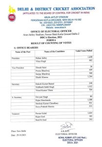 सचिव पद के लिए भाजपा सांसद प्रवेश वर्मा के छोटे भाई सिद्धार्थ वर्मा ने भी एकतरफा जीत हासिल की। उन्होंने रोहन जेटली पैनल के उम्मीदवार विनोद तिहारा को 704 के मुकाबले 1322 वोटों से हराया। डीडीसीए के चुनाव में सभी पदों पर ‘भाजपाई’ खेमे से जुड़े लोगों की जीत हुई है।