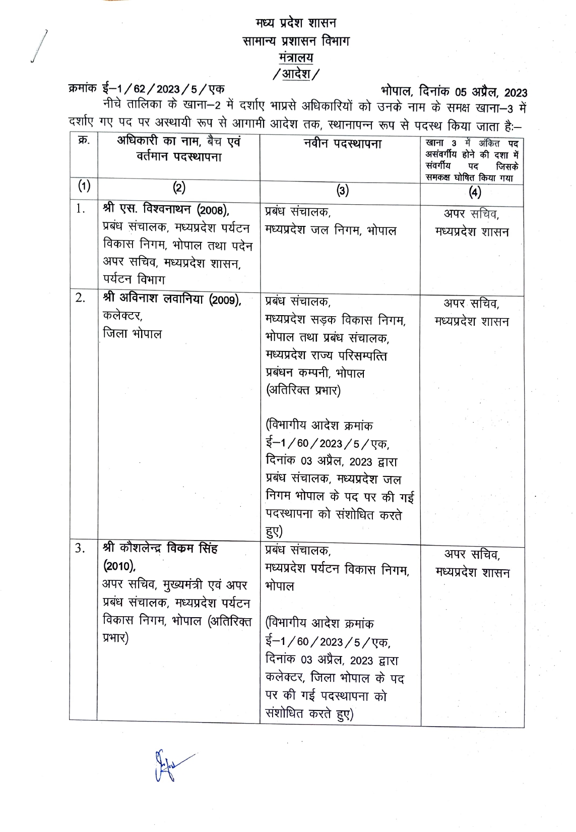 2009 बैच के आईएएस भोपाल कलेक्टर अविनाश लवानिया की पदस्थापना भी बदलाव किया गया है। उनके जल निगम भोपाल के प्रबंध संचालक के आदेश को संशोधित कर मध्य प्रदेश सड़क विकास निगम का प्रबंध संचालक और मध्य प्रदेश राज्य परिसम्पत्ति प्रबंधन कंपनी के प्रबंध संचालक का अतिरिक्त प्रभार सौंपा है।