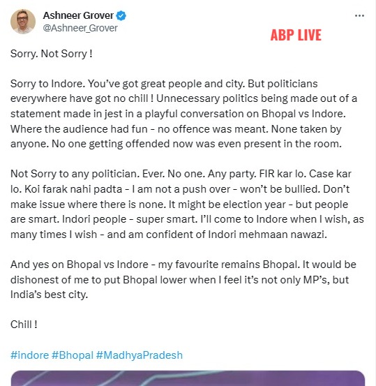 इंदौर। भारत पे के सह संस्थापक और देश में जाने माने इनवेस्टर अशनीर ग्रोवर द्वारा दिए गए विवादित बयान का मामला थमने का नाम नही ले रहा है। इंदौर स्वच्छता सर्वे के मामले में अशनीर ग्रोवर का नया ट्वीट सामने आया है। जिसमें उन्होंने लिखा है कि क्षमा मांगना। खेद नहीं !
