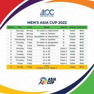 इस इवेंट में 27 अगस्त से 31 अगस्त तक ग्रुप मैच होंगे, इसके बाद सुपर-4 की टीमों के मैच होंगे जो 3 सितंबर से 9 सितंबर तक होंगे. जबकि रविवार 11 सितंबर को एशिया कप 2022 का फाइनल मुकाबला होगा.