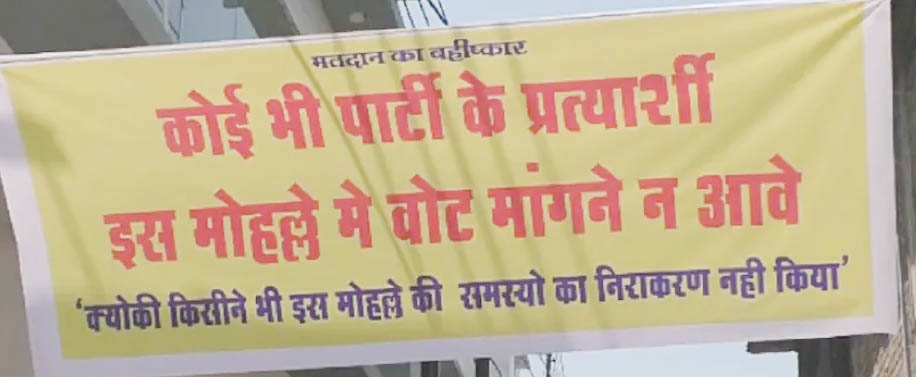 गांजीपुर। उत्तरप्रदेश में विधानसभा चुनाव (Assembly elections in Uttar Pradesh) की तारीकों का ऐलान होते ही राजनीतिक सरगर्मियां तेज (political activity intensifies) हो गई है। एक तरफ जहां नेता माहौल को देखते ही भांव रहे तो वहीं कुछ का खुलकर विरोध भी सामने आने लगा है। नेता वर्तमान स्थिति को देखते हुए दूसरी पार्टियों का दामन थामने लगे हैं। तो दूसरी ओर पांच साल राह तक रही जनता भी अब नेताओं को सबक सिखाने के लिए खुलकर मैदान में आ गई है। ऐसा ही मामला उत्तरप्रदेश के गांजीपुर में देखने को मिल रहा है। जहां पर जनता भी अपनी समस्याओं को लेकर अनोखा तरीका अपनाने लगी है। कोतवाली थाना क्षेत्र के पांडे कॉलोनी से सामने आया है, वहां के लोगों ने कॉलोनी की मुख्य सड़क के सामने बैनर लगाकर चुनाव बहिष्कार कर दिया है। यहां तक कि बैनर में साफ शब्दों में लिखा है कि कृपया वोट मांग कर शर्मिंदा ना करें जो इस समय बैनर सोशल मीडिया पर जमकर वायरल हो रहा है।