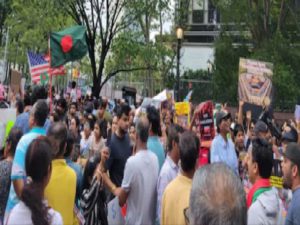 बांग्लादेश में अल्पसंख्यकों पर अत्याचार को देखते हुए अमेरिका के न्यूयॉर्क में यूएन के हेडक्वार्टर के बाहर एकत्रित होकर लोगों ने बांग्लादेश में अल्पसंख्यकों की सुरक्षा की मांग की.वाशिंगटन के एक एनजीओ ने यूएन के हेडक्वार्टर के पास उनके प्रोटेस्ट को समर्थन देने आए लोगों का शुक्रिया आदा किया. उन्होंने कहा कि बांग्लादेश में हिंदुओं को निशाना बनाकर की गई हिंसक हमला के खिलाफ बोलने वाले अमेरिकी नेताओं की हम तारीफ करते हैं.
