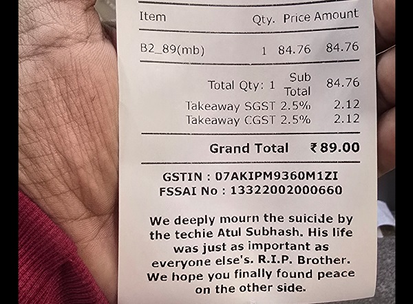 Reddit पर एक पोस्ट शेयर करते हुए एक यूजर ने दावा किया कि उसका एक दोस्त हौज खास मेट्रो स्टेशन पर पहुंचा था। वह जंबोकिंग फ्रैंचाइजी के आउटलेट पर रुका। बिल पर उसे अलग ही मैसेज दिखा। इस मैसेज में लिखा था, “हम टेक एक्सपर्ट अतुल सुभाष की आत्महत्या पर गहरा शोक व्यक्त करते हैं। उनकी जिंदगी भी उतनी ही कीमती थी जितनी हम सब की। RIP भाई। हमें उम्मीद है कि आपको दूसरी तरफ शांति मिली होगी।” पोस्ट में शख्स ने बताया कि आउटलेट के मालिक से बात करने पर उसने कहा, “हमारे लिए सब कुछ सिर्फ बिजनेस नहीं है। उसकी जिंदगी कीमती थी। हम उसे वापस तो नहीं ला सकते लेकिन कम से कम हम उसे अपनी यादों में जिंदा रखने के लिए कोशिश तो कर ही सकते हैं।”