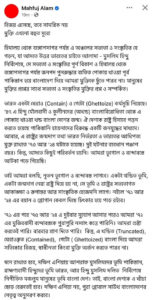 महफूज आलम ने अपने पोस्ट में लिखा कि पूर्वोत्तर भारत और बांग्लादेश में लोगों की संस्कृति धर्म से इतर ‘एक जैसी’ है। फिर उसने दावा किया कि पूर्वी पाकिस्तान का निर्माण ऊंची जातियों और ‘हिंदू कट्टरपंथियों’ के ‘बंगाल विरोधी रवैये’ के कारण हुआ। महफूज आलम ने दावा किया, “भारत ने एक नियंत्रण और यहूदी बस्ती कार्यक्रम अपनाया है…भारत से सच्ची आजादी सुनिश्चित करने के लिए, हमें 1975 और 2024 को दोहराना होगा।”