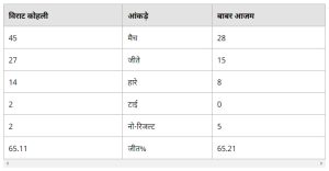 दोनों के करियर की बात करें तो कोहली ने 91 टेस्ट मैचों में 52.38 की औसत से 7490 रन बनाए हैं। इस दौरान 27 शतक और 25 अर्धशतक ठोके हैं। 7 दोहरे शतक उनके बल्ले से निकले हैं। दूसरी ओर, बाबर ने 33 टेस्ट 42.53 की औसत से 2169 रन ठोके हैं। उनके बल्ले से 5 शतक और 16 अर्धशतक निकले हैं। वनडे में कोहली ने 254 मैच में 59.07 की औसत से 12169 और बाबर ने 80 मैचों में 56.84 की औसत से 3808 रन बनाए हैं। कोहली ने 43 शतक और 62 अर्धशतक जड़े हैं। वहीं, बाबर के बल्ले से 13 शतक और 17 अर्धशतक निकले हैं।