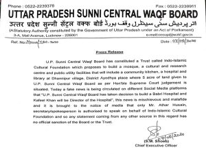 लखनऊ। सुन्नी वक्फ बोर्ड ने अयोध्या में बाबरी अस्पताल बनाने की खबरों का खंडन किया है। बता दें कि सोशल मीडिया पर सुन्नी वक्फ बोर्ड को मिली जमीन पर बाबरी अस्पताल बनाने की खबर वायरल हो रही थी। खबर में डॉ. कफील खान को अस्पताल का निदेशक बनाए जाने की बात भी कही गई थी। अब सुन्नी वक्फ बोर्ड ने इस बात का खंडन किया है।