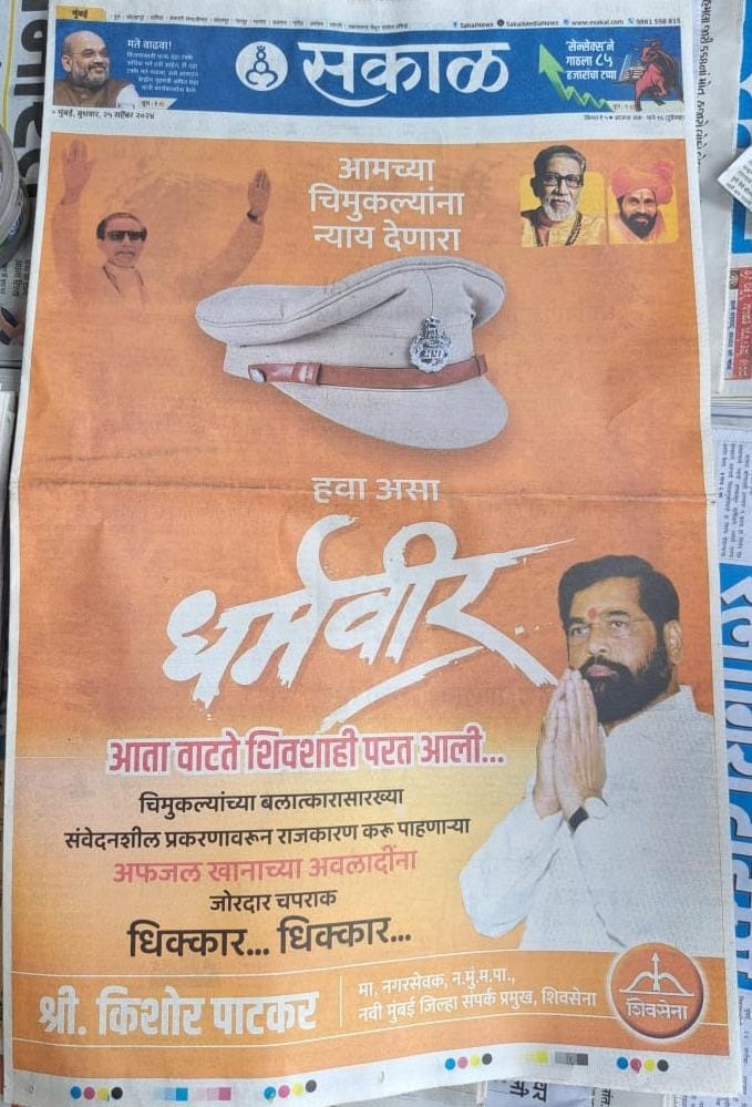 वहीं एक शिवसेना नेता द्वारा एक लोकल न्यूजपेपर में एक विज्ञापन दिया गया जिसमें महाराष्ट्र के मुख्यमंत्री एकनाथ शिंदे की तस्वीर लगी हुई है. फोटो के साथ लिखा है, ‘हमारे बच्चों को न्याय देने वाला’.
