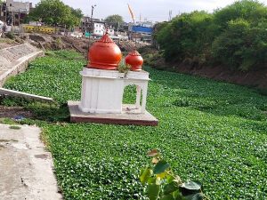घाट का गणेश मंदिर जलकुंभी से घिरा