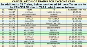 तूफान के खतरे को देखते हुए भारतीय रेलवे (Indian Railway) बंगाल और ओडिशा रूट पर चलने वाली 90 ट्रेनों को रद्द कर दिया है. उत्तर रेलवे ने दिल्ली से ओडिशा के भुवनेश्वर और पुरी जाने वाली एक दर्जन से अधिक ट्रेनों को रद्द कर दिया है, वहीं दक्षिण रेलवे ने भी चक्रवात यास के कारण कई ट्रेन सेवाओं को अस्थायी रूप से रद्द कर दिया है. इससे पहले रविवार को पूर्व रेलवे ने 29 मई तक 25 ट्रेनों को रद्द कर दिया था.