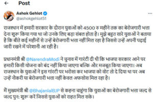 पूर्व मुख्यमंत्री अशोक गहलोत ने सोशल मीडिया पर एक ट्वीट कर आरोप लगाया कि राज्य सरकार ने बेरोजगारी भत्ते के बिलों को रोक रखा है। उन्होंने कहा कि पिछले साल अगस्त से ही वित्त विभाग ने बेरोजगारी भत्ते के बिल रोक लिए थे, जो अब तक पेंडिंग चल रहे हैं। गहलोत ने लिखा : “राजस्थान में हमारी सरकार के दौरान युवाओं को 4500 रु महीने तक का बेरोजगारी भत्ता देना शुरू किया गया था जो उनके लिए बड़ा संबल होता है। मुझे बहुत सारे युवाओं ने बताया है कि बीते कई महीनों से उन्हें बेरोजगारी भत्ता नहीं मिल रहा है जिससे उन्हें अपनी पढ़ाई जारी रखने में परेशानी आ रही है।” गहलोत के आरोप के अनुसार, वित्त विभाग ने न केवल बेरोजगारी भत्ते के बिल रोके हैं, बल्कि पंचायतों को मिलने वाली ग्रांट, सामाजिक सुरक्षा पेंशन, आरजीएचएस के भुगतान और आरटीई जैसी अहम योजनाओं के भुगतान भी रोक रखे हैं। इससे जनता में नाराजगी बढ़ रही है और यह नई सरकार के लिए एक बड़ा मुद्दा बन गया है।