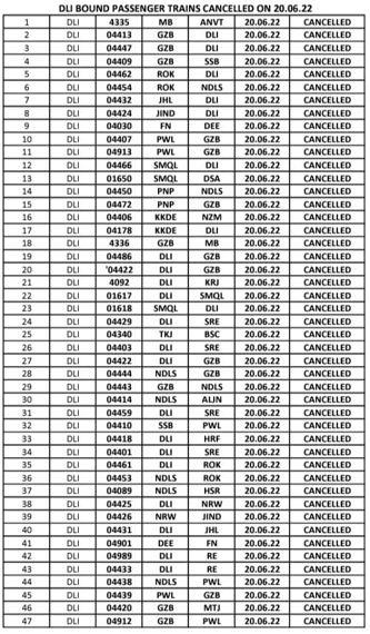 नॉर्दन रेलवे (Northern Railway) के मुताबिक, दिल्ली की 71 ट्रेनों को आज यानी 20 जून को पूरी तरह रद्द कर दिया गया है. यहां देखें लिस्ट
